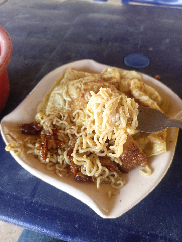 The image depicts a close-up of a meal served on a light-colored, possibly off-white, plate with a wavy edge, positioned on a dark blue, textured surface, consistent with a plastic table. The meal consists of cooked instant noodles mixed with a reddish spice, several pieces of dark brown, fried or stewed meat, and a folded, yellow-golden omelet or fried egg. A silver-colored metal fork is shown lifting a portion of noodles from the plate. To the left, a portion of a red container is visible. A small, circular blue plastic object, possibly a cap, is present on the table surface to the right of the plate. The background is out of focus. This scene is located in Doma, Nigeria, and captures a casual dining instance.