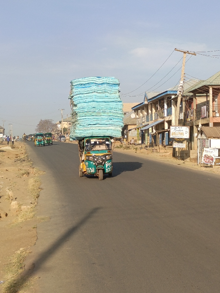 - "A three-wheeled vehicle is heavily loaded with light blue foam mattresses, nearly double its height, traveling on a paved road" by FM-hmmAj2, licensed under CC BY 4.0