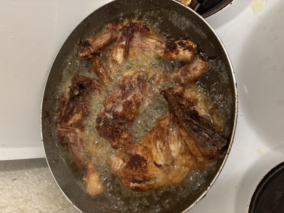 - "The image displays a dark, round frying pan actively deep-frying multiple pieces of chicken in bubbling oil" by FM-WTbt02, licensed under CC BY 4.0