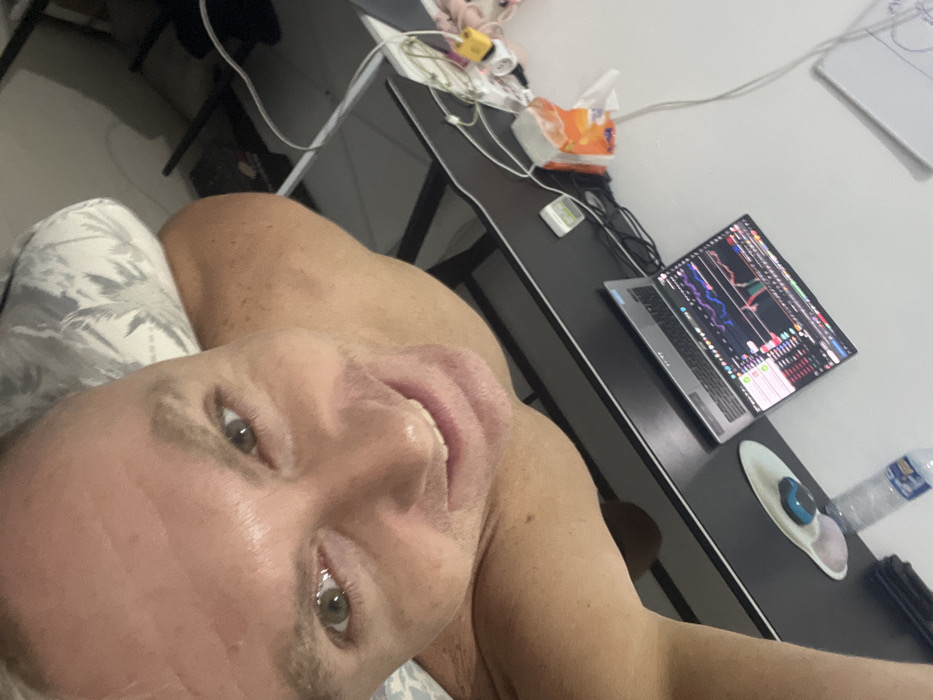 A person lies in bed near a desk, face close to the camera. On the desk is a laptop displaying charts and graphs, a mouse and pad, and a water bottle. The desk also holds a box of tissues, cables, and miscellaneous items. The room is brightly lit with white walls.