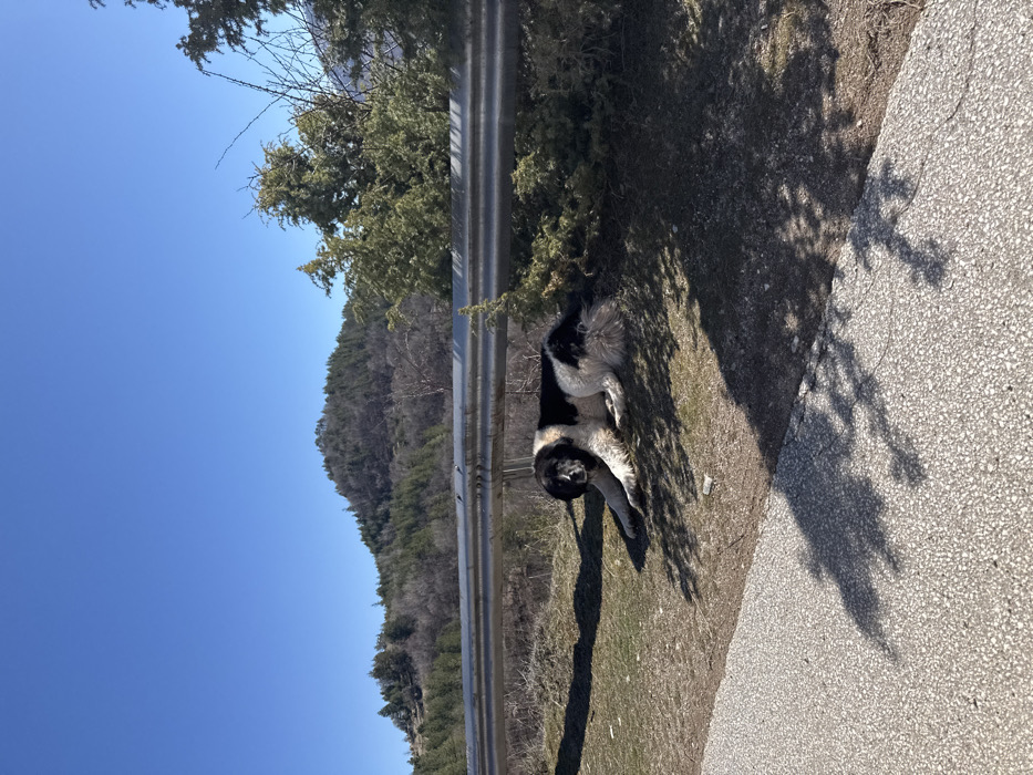 A large, black and white, long-haired dog lies on dry earth and sparse grass beside a paved road in the city of Borovo, Bulgaria