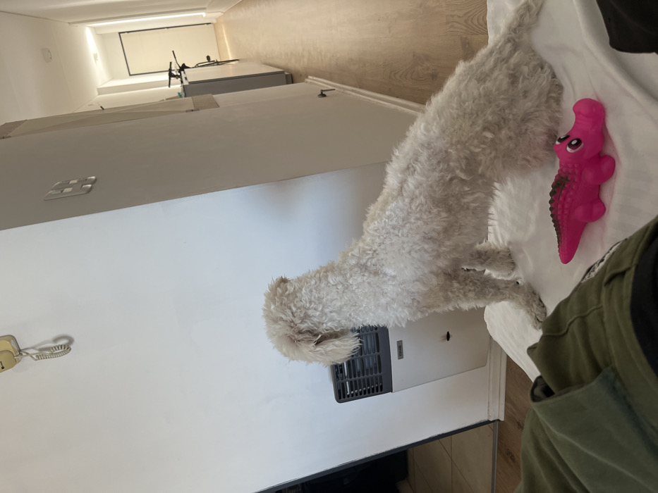 The image displays an indoor residential scene in Cordoba, Argentina. A cream-colored, curly-coated dog stands prominently on a white fabric surface, positioned with its body facing towards the left side of the frame. Its head is slightly turned towards a white wall, where a grey and white wall-mounted Eskabe gas heater is installed. Directly above the heater, a beige wall-mounted corded telephone with a coiled cord is affixed. To the dog's immediate right, on the white fabric surface, lies a bright pink rubber toy shaped like an alligator, featuring black and white eyes. The lower legs of an individual, dressed in olive green pants, are visible in the bottom-left foreground. The background reveals a brightly lit, narrow hallway extending into the distance, characterized by light-colored walls and light wood flooring. A bicycle is partially visible leaning against light-colored furniture on the right side of the hallway, which terminates at a closed white door.