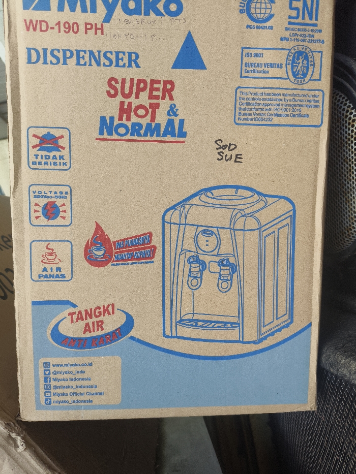 cardboard box for a Miyako WD-190 PH water dispenser. The box indicates the dispenser provides "Super Hot & Normal" water, is quiet ("TIDAK BERISIK"), and has a corrosion-resistant water tank ("TANGKI AIR ANTI KARAT"). It displays the brand's social media handles and website. The box also features ISO 9001 and SNI certification logos, with Bureau Veritas mentioned as the certifying body. There's some handwritten text ("SOD SUE") and other markings on the box.