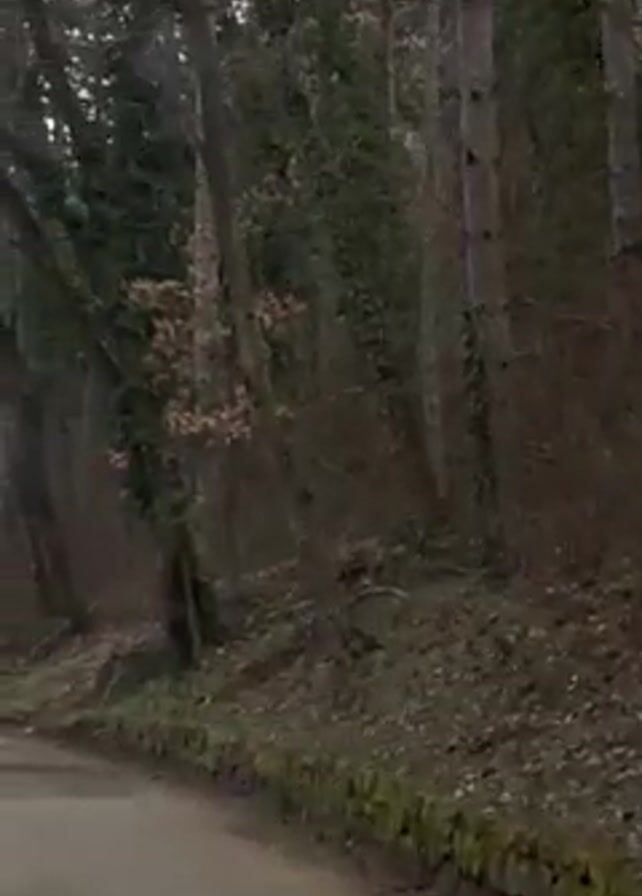 The camera travels along a winding road, bordered by a dense forest on one side. The trees are bare of leaves, with some covered in ivy. The forest floor is covered in fallen leaves and branches. The road is gray and appears wet in places. There is a low stone wall bordering the road and the forest edge. The sky is overcast.