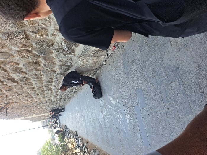 The image depicts an outdoor scene on a paved sidewalk adjacent to a large, ancient stone wall identified as part of the Citadel of Damascus in Syria. In the mid-ground, a middle-aged male, appearing bald with a dark beard, is barefoot and leaning against the base of the stone wall. He is wearing a dark tracksuit jacket with three white stripes on the sleeves and dark trousers. He is bent over a black duffel bag on the ground, interacting with its contents, and is looking towards the camera. The wall is constructed from large, irregularly shaped, light-colored stone blocks, extending into the background. In the immediate foreground, to the right, the back and right shoulder of an individual wearing a black t-shirt and a black backpack are visible. In the lower left foreground, a portion of another person's arm is visible. The sidewalk is paved with rectangular grey slabs. To the left of the sidewalk, an unpaved, uneven area contains rubble and sparse dry vegetation. Further in the background, along the wall, several indistinct figures are visible walking away from the camera. Beyond the unpaved area, a street with vehicles and distant buildings can be discerned under a bright sky.