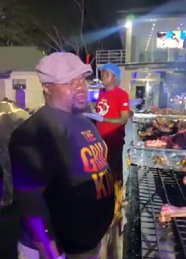 man wearing a hat and a t-shirt that says "The Grill King," standing near a large grill with meat cooking on it. Another person wearing a blue hat and a red t-shirt with the number 50 on it stands behind him. The grill is covered with foil and various cuts of meat. The scene is outdoors at night and there is a building with lights in the background. The man in the "Grill King" shirt speaks to the camera. Smoke rises from the grill.