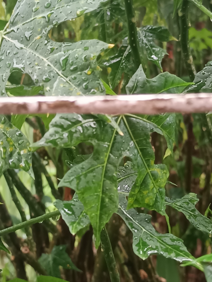 The image depicts a close-up view of wet foliage in Limbangan Sari, Indonesia, following precipitation. Multiple deeply lobed, dark green leaves, likely from a tropical plant, are prominently featured, heavily coated with numerous clear water droplets of varying sizes. Some leaves exhibit areas of lighter green or yellowish discoloration. A blurry, light brown, horizontal linear object, possibly a wooden branch or railing, extends across the mid-foreground, partially obscuring the lower and central portions of the foliage. The background consists of heavily blurred green and dark green vegetation. No individuals or active subjects are present.
