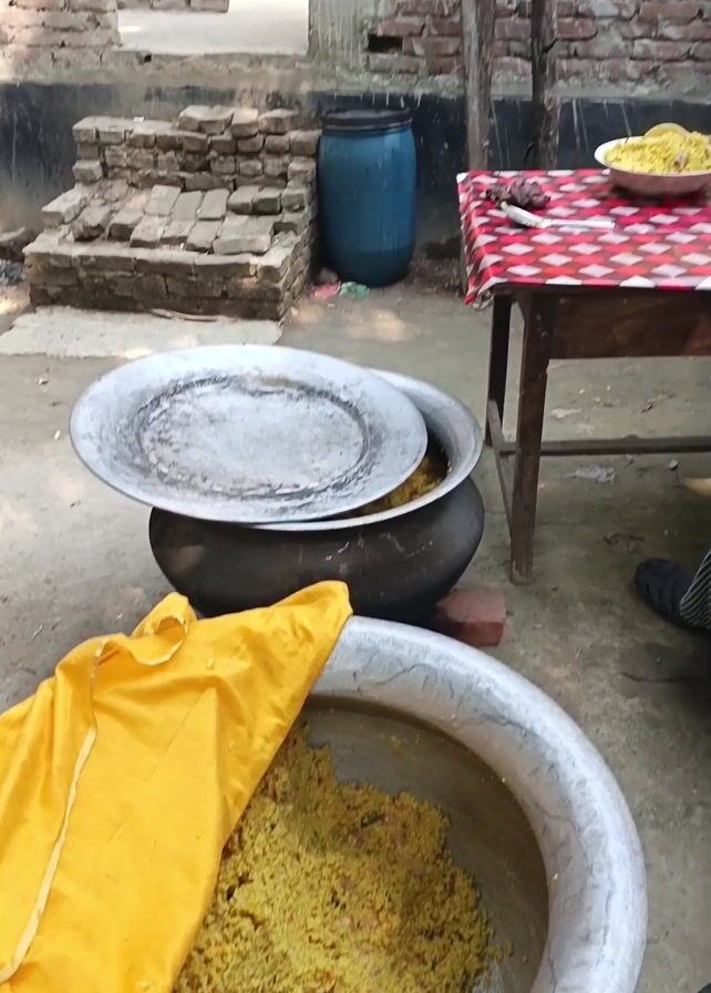 n outdoor scene with food preparation and people. Two large bowls containing a yellow dish, likely rice, are in the foreground. One bowl is partially covered with a yellow cloth. A table with a red checkered tablecloth is in the background, holding metal dishes filled with food. People are sitting around the table and standing nearby. One person is smoking. The setting appears to be a rural area with brick structures and natural elements like bamboo and foliage.