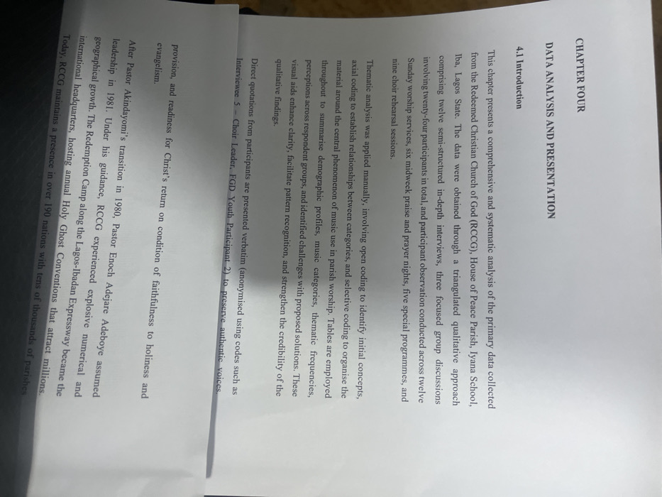 Chapter Four presents data analysis and presentation from the Redeemed Christian Church of God, House of Peace Parish, Iyana School, Lagos State. Data was collected via in-depth interviews, group discussions, and participant observation. Thematic analysis was applied to identify concepts, establish relationships, and organize music use in parish worship. Tables summarize demographics, music categories, and perceptions. Direct participant quotes are included, anonymized with codes. This chapter discusses the provision and readiness for Christ's return conditional on faithfulness to holiness and evangelism. After Pastor Akindayomi's transition, Pastor Adeboye guided RCCG to explosive growth.