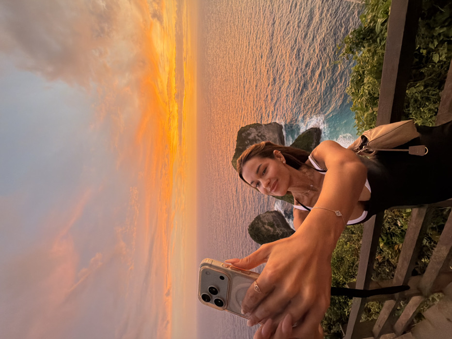A female subject is depicted taking a selfie with a smartphone from a coastal cliff in Bunga Mekar, Indonesia, during a sunset or sunrise