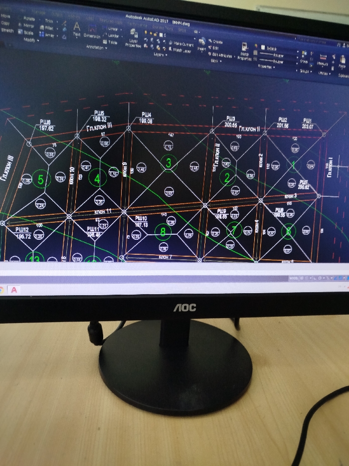 An AOC computer monitor, displaying Autodesk AutoCAD 2017 software, is positioned on a light-colored wooden desk. The screen exhibits a technical drawing with a black background, featuring a grid of interconnected squares and hexagons. Within these shapes, numerous circular elements are visible, some outlined in green and containing green numbers (e.g., 1, 2, 3, 4, 5, 7, 8). White alphanumeric labels, including "PW" followed by numbers (e.g., PW1 203.07, PW2 201.56, PW3 200.65), and text in Cyrillic characters (e.g., "ГЛ.КЛОН III", "ГЛ.КЛОН II", "КЛОН 11") are present on the drawing. A portion of the Windows taskbar is visible at the bottom of the screen. A black cable extends from the right side, partially visible on the desk. No individuals are present in the image, nor are any specific actions depicted. The location is Unknown, Unknown.