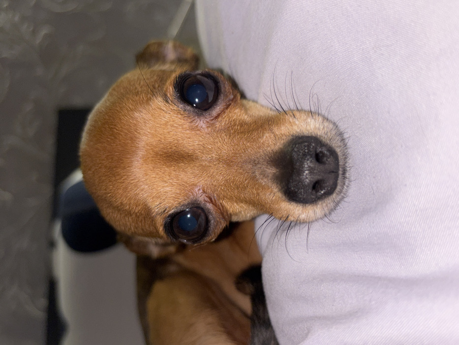 Location: Unknown, Unknown. A small, short-haired dog, consistent with a toy breed such as a Chihuahua or Miniature Pinscher, is depicted in a close-up, head-on view. The animal's fur is predominantly tan-brown. Its head is centered in the frame, with the body partially visible to the left, curled and resting on a light lavender or grey fabric, likely a bedsheet or blanket, which shows slight wrinkling. The dog possesses two large, dark, prominent eyes that are directed towards the viewer, reflecting ambient light. A black, textured nose with visible nostrils is centered at the bottom of its snout. Multiple fine, dark whiskers extend from either side of its muzzle. The ears are small and blend with the head fur. The background is dimly lit and blurred, containing dark, indistinct shapes, including a segment of a dark blue object in the upper left. No human figures are present. The dog is stationary, exhibiting a direct gaze.