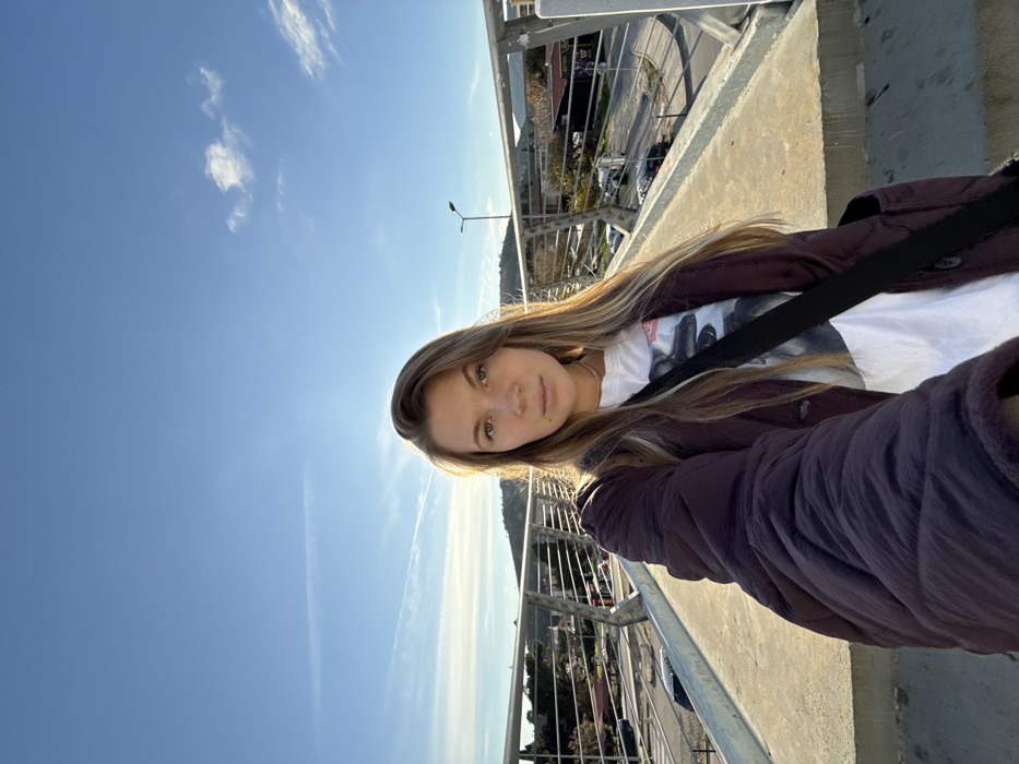 A female individual is depicted in a selfie taken on a pedestrian overpass in Sutomore, Montenegro