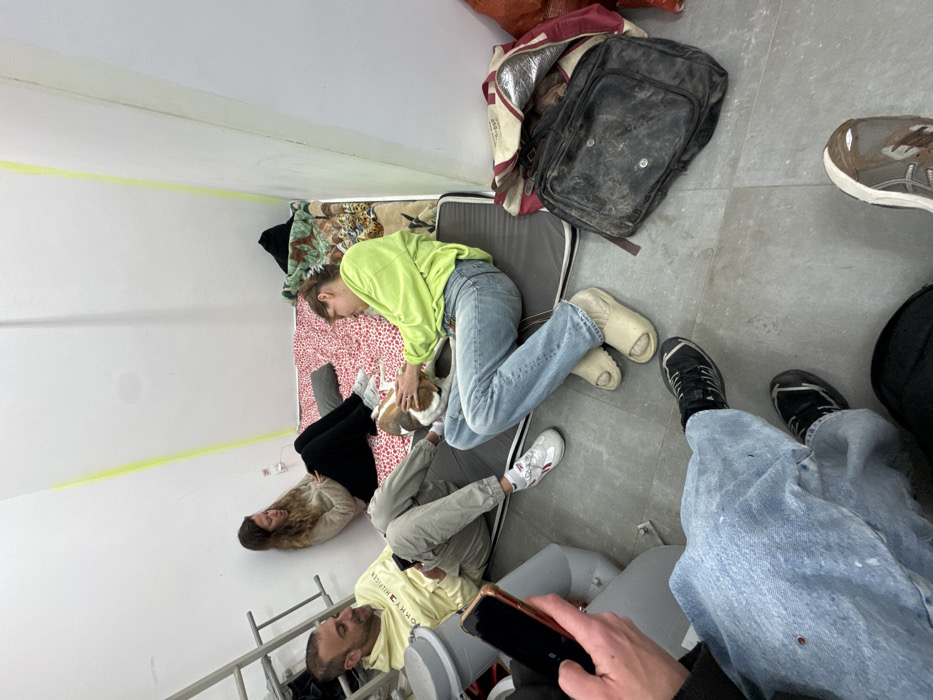 The image displays an interior scene, identified as likely a bomb shelter or communal protected space within Tel-Aviv, Israel. Four individuals are present, resting or waiting. On the left, a male with a beard and short dark hair, wearing a yellow hooded sweatshirt with the "TOMMY HILFIGER" logo and grey pants, is seated on the grey tiled floor, leaning against a white wall. He is looking towards the right with a slight smile, holding a dark smartphone in his left hand. A grey cylindrical object is next to him. Behind him, a metal ladder-like structure leans against the wall. In the mid-ground, a female with long brown hair, wearing a beige long-sleeved top and black pants, is seated on a red and white patterned floor mattress, leaning against the white wall. She is looking down at a smartphone in her hands. An electrical outlet and a water bottle are visible on the wall and floor near her. To her right, a second female, with brown hair tied back, wearing a bright neon green long-sleeved sweatshirt and light blue jeans, is seated on a grey floor mattress. She is petting a small, brown, white, and black dog that rests on the mattress beside her. In the immediate foreground, only the lower half of a fourth person is visible, wearing light blue jeans with white paint splatters and black sneakers. A hand holding a dark smartphone extends into the frame from this position. The room features white painted walls, accented by a vertical neon green stripe in the corner, and a grey tiled floor. On the right side of the image, a worn black messenger bag and a red and white striped bag are placed on the floor, adjacent to an orange sack. A black hoodie and patterned blanket are visible on the grey mattress behind the female in green.