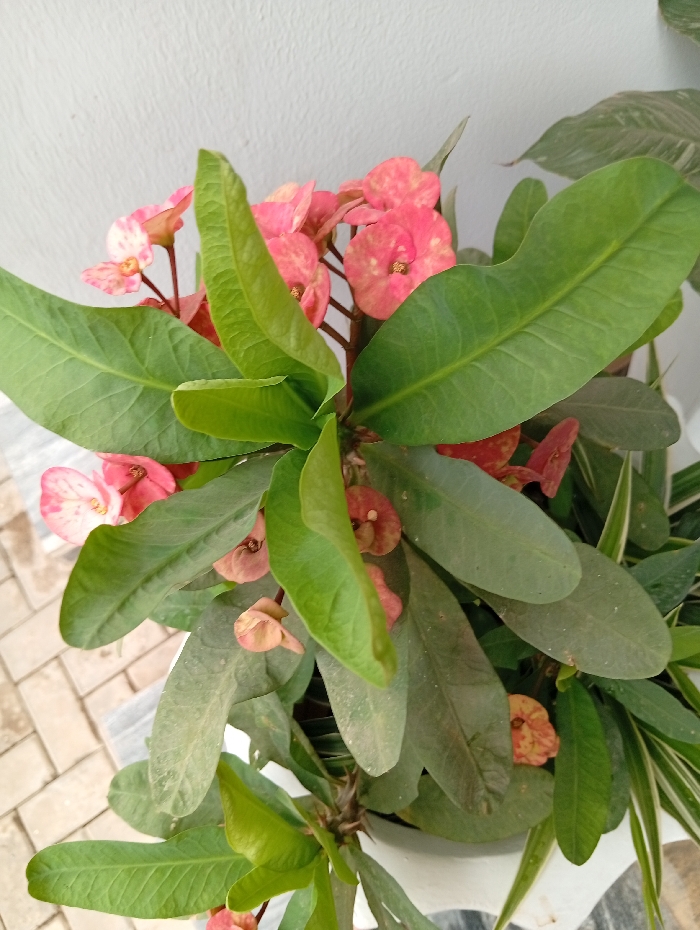 This image displays a close-up, elevated perspective of a flowering Crown of Thorns plant (Euphorbia milii) situated in Abuja, Nigeria. The plant exhibits numerous dark green, ovate leaves and clusters of pinkish-red bracts, some featuring lighter, mottled centers. Thorny stems are visible among the foliage. The plant is housed in a white pot, partially visible at the bottom and right. A plain, light-colored wall serves as the background. The ground directly beneath the plant is paved with light-toned, rectangular interlocking bricks arranged in a pattern. A second plant with variegated green and white leaves is partially visible to the right of the primary subject.