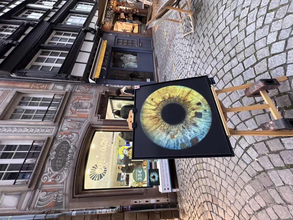 The scene depicts a cobblestone street in Strasbourg, France. In the foreground, a large, black-framed square sign rests on a light wooden easel, displaying a macro photograph of a human iris with a prominent vertical division of blue and yellow-brown coloration. The easel's base is weighted by two dark, rectangular blocks. To the left, a multi-story building features an ornate, painted facade with gray scrollwork and orange details, inscribed with "KELSCH" above its ground-level shopfront. This shop, identified as "Eyemazy" by its illuminated window signage and logo, contains several individuals. A smaller promotional sign adjacent to the window states "A partir de 35€" and includes text in English and German regarding iris art. A dark utility pole stands at the far left. To the right, a traditional dark-timbered building with white infill panels houses a blue-painted shopfront with a yellow awning marked "Blanc du Nil." Mannequins are visible within its display window. Further right, another shop with a yellow awning is partially visible, adorned with lights and displaying various items. Two wooden deck chairs are placed on the cobblestones in front of the right-side buildings. The street is uniformly paved with light-colored cobblestones arranged in a fan-like pattern.