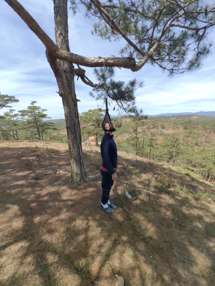 A person stands outdoors on a grassy, pine needle-covered hillside next to a tree. The tree has a makeshift head sling suspended from a branch, enveloping the person's head. The person is dressed in a dark blue jacket and pants, with red trim visible on the jacket, and wears blue sandals. The landscape behind includes rolling hills covered in sparse trees and a sky with scattered clouds.