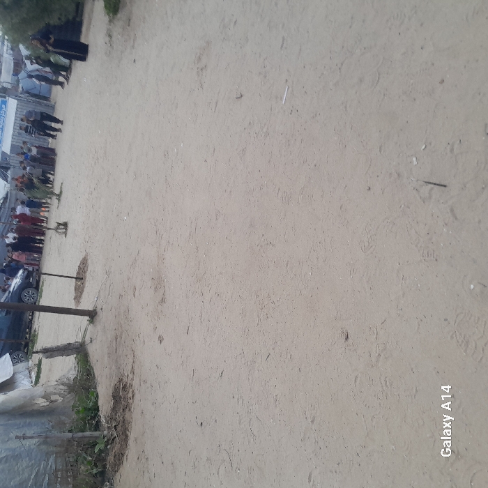 A grainy, ground-level perspective captures a large, sandy expanse. A group of people stand in the distance, alongside a parked car and a partially visible building. A dark pole intersects the scene on the left, suggesting a structure or barrier. The sandy ground dominates the image, showing textures and subtle variations in color. The overall impression is one of an outdoor gathering in a somewhat barren or undeveloped area.