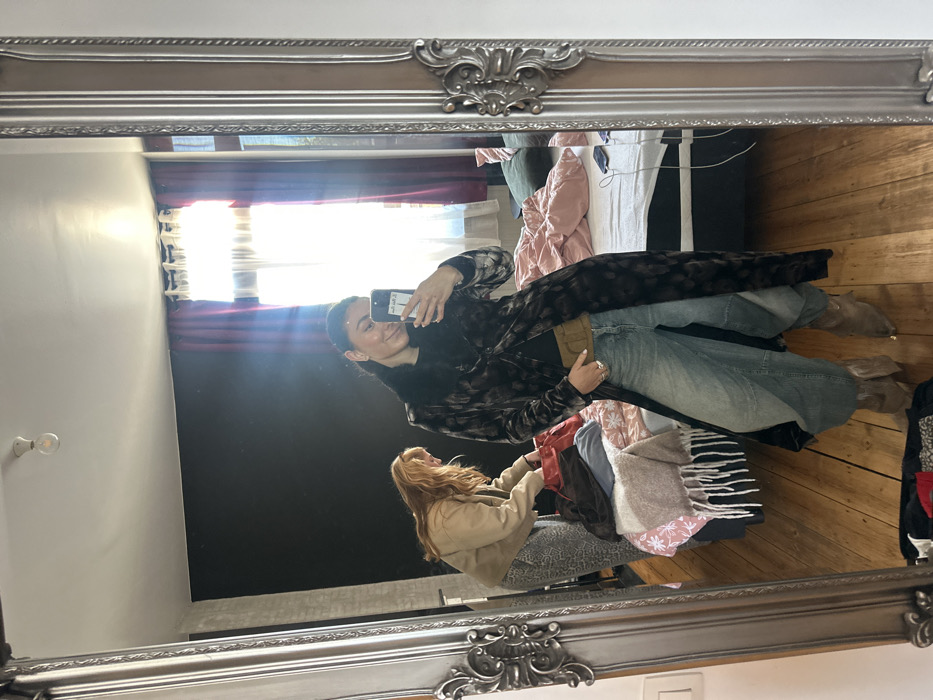 The image displays a mirror reflection of an interior scene, likely a bedroom or dressing area, located in a residence in Antwerp, Belgium. A young adult female is centered in the reflection, taking a mirror selfie with a dark-cased smartphone. She smiles, wears a long, dark patterned velvet coat with a black fur collar, light-wash baggy denim jeans, a light brown fanny pack, and light brown heeled ankle boots. Rings are visible on her left hand. To her left and behind her, a second female with reddish-blonde hair is partially visible. She wears a tan jacket and patterned trousers, bending over a pile of clothing and a red handbag resting on a bed. The room's visible elements include a dark-colored wall section, a bed with a disheveled pink duvet, a white fringed blanket with red patterns, and a dark smartphone with a white charging cable on its surface. A large window with white sheer curtains and dark red drapes is visible in the background, admitting significant natural light. The floor is composed of light-colored wooden planks. A single exposed light bulb hangs from the white ceiling. The mirror itself features an ornate, silver-colored frame.