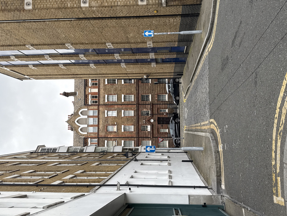 The image depicts a narrow urban street in the Borough Market area of London, United Kingdom, specifically looking towards the market buildings. The street in the foreground is asphalt with double yellow lines indicating parking restrictions, transitioning to a cobbled surface further down at an intersection. Paved sidewalks run along both sides. On the left, a multi-story building presents a white lower facade and light brown brick upper levels with numerous white-framed windows. A small security camera is mounted on its white wall, and a green metal gate is partially visible at the extreme left. A black, ornate streetlamp stands on the left pavement, alongside a blue rectangular road sign with a white upward arrow, indicating a one-way street. On the right, another multi-story building constructed of light brown brick features prominent vertical blue panels, possibly large windows or decorative elements, and a dark blue door at ground level. A similar blue rectangular one-way arrow sign is present on the right pavement. At the end of the street, dominating the view, is a five-story reddish-brown brick building with multiple white-framed windows. Its topmost floor showcases a distinctive central section with three arched dormer windows and a visible clock face. A chimney is present on its roof. A "Give Way" sign is visible on the left pavement in front of this building. Two dark-colored cars are parked on the cobbled street section at the far end, with a black Tesla-like vehicle prominent on the left. The sky is overcast. No individuals are visible.