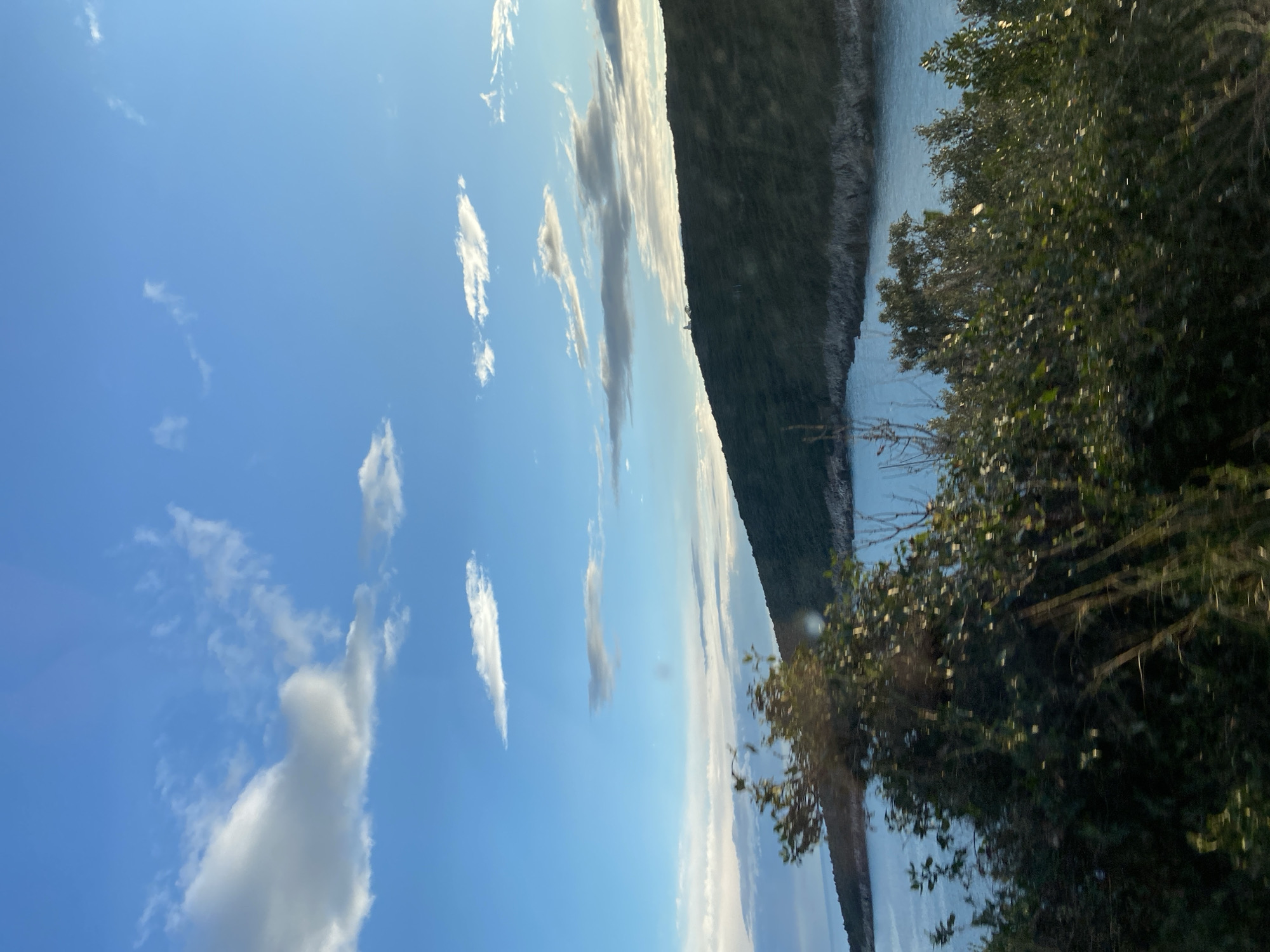 daytime landscape scene in Dubraljevina, Montenegro. The sky is blue with scattered white clouds. A dark green, steep hillside extends diagonally across the image. Adjacent to the hillside is a body of water reflecting the sky. In the foreground, there is a dense cluster of trees with green leaves. The image is slightly blurred, suggesting movement during the capture.