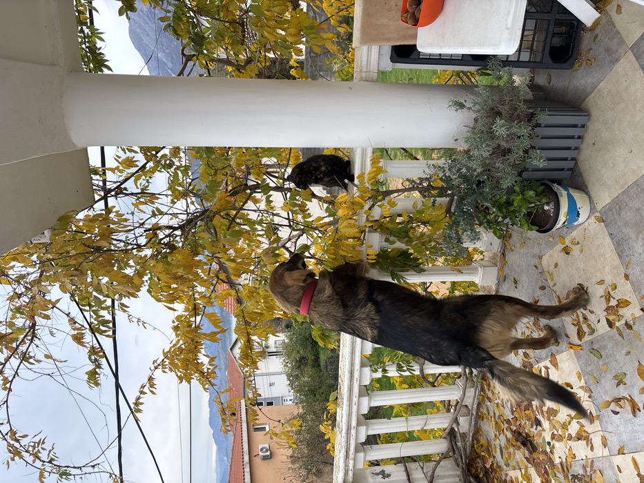 A brown and black dog with a pink collar stretches upwards towards a tree with yellow leaves. A black cat sits on the railing behind the tree. The railing is white and a white pillar is next to the tree. There is a building and mountains in the background. The ground is tiled and covered in leaves. There are plants in pots next to the tree.