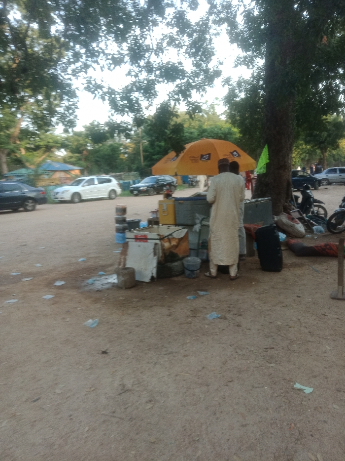 - "This image depicts an outdoor commercial or gathering area in Gandu Albasa, Nigeria, characterized by an unpaved, light brown dirt ground with scattered light blue plastic litter" by FM-Fm7VJ2, licensed under CC BY 4.0
