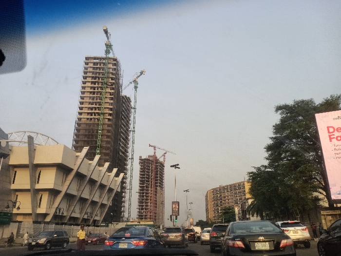 A cityscape shows buildings under construction, one notably tall, with cranes atop. An angular building stands near the street, and several cars fill the road, indicating traffic. A billboard is visible amidst trees. The sky is pale, suggesting daytime, and the overall scene conveys urban activity.