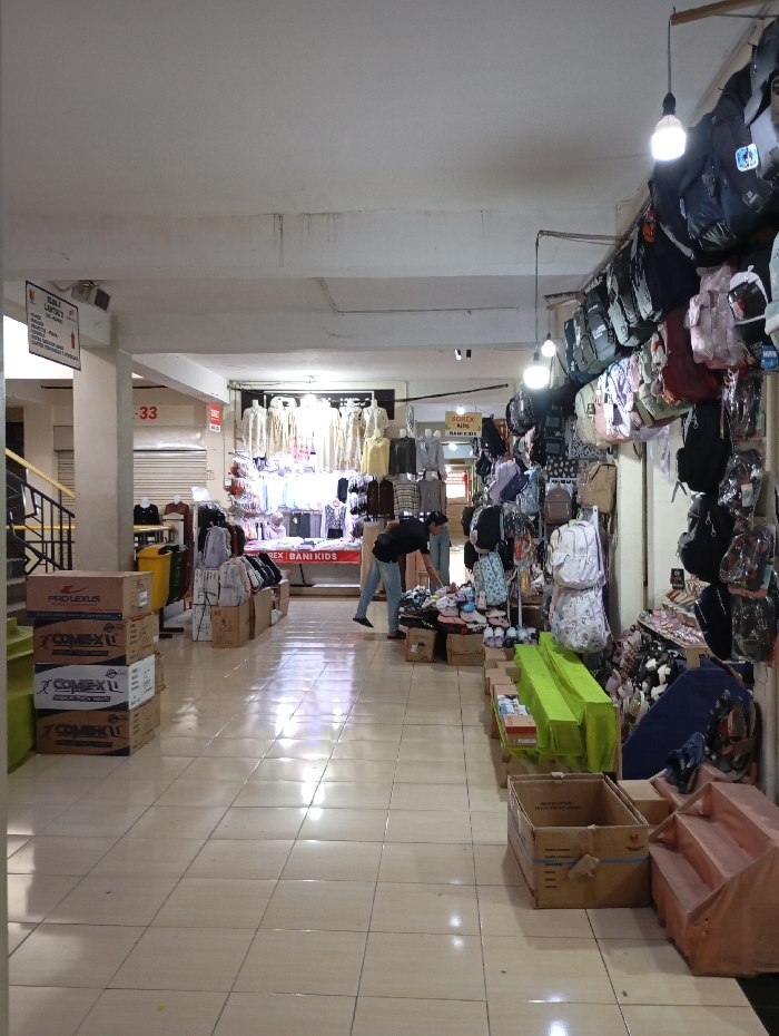 The image depicts an indoor market aisle in an unknown city. The light-colored tiled floor reflects artificial light. On the left, stacks of cardboard boxes, some labeled "PROLEXUS" and "COMEX U," are arranged along the aisle. A yellow trash bin is visible next to a pillar marked "33." Further back, a staircase with metal railings ascends, and a white sign partially visible indicates "LANTAI 3." A brightly lit clothing stall with mannequins and a "BANI KIDS" sign is visible in the background on the left. On the right side, a retail stall displays numerous bags, including backpacks and handbags, hanging from an overhead structure illuminated by multiple exposed incandescent bulbs. Below these, various shoes and sandals are arranged on low tables and stands. Two individuals are present in the central-right portion of the aisle near the shoe display. One person, wearing a dark shirt and light blue jeans, is bent over, examining or arranging merchandise. Another person stands partially obscured behind them. The white ceiling shows visible stains and dirt marks.