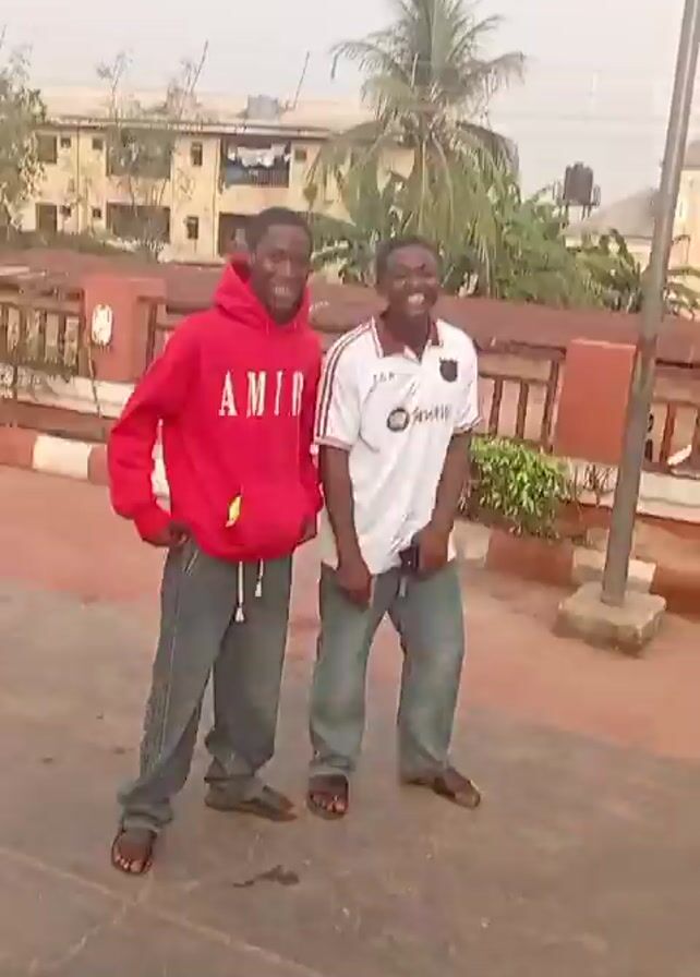 Two young men stand side-by-side outdoors. The man on the left wears a red hoodie with "AMIR" printed in white, gray pants, and sandals. The man on the right wears a white soccer jersey with a Spotify logo, gray pants, and sandals. They both face the camera and smile. Behind them is a building, foliage including a palm tree, a reddish-brown fence, and a white-painted curb. A utility pole is visible. The ground appears to be concrete or asphalt. The sky is overcast.