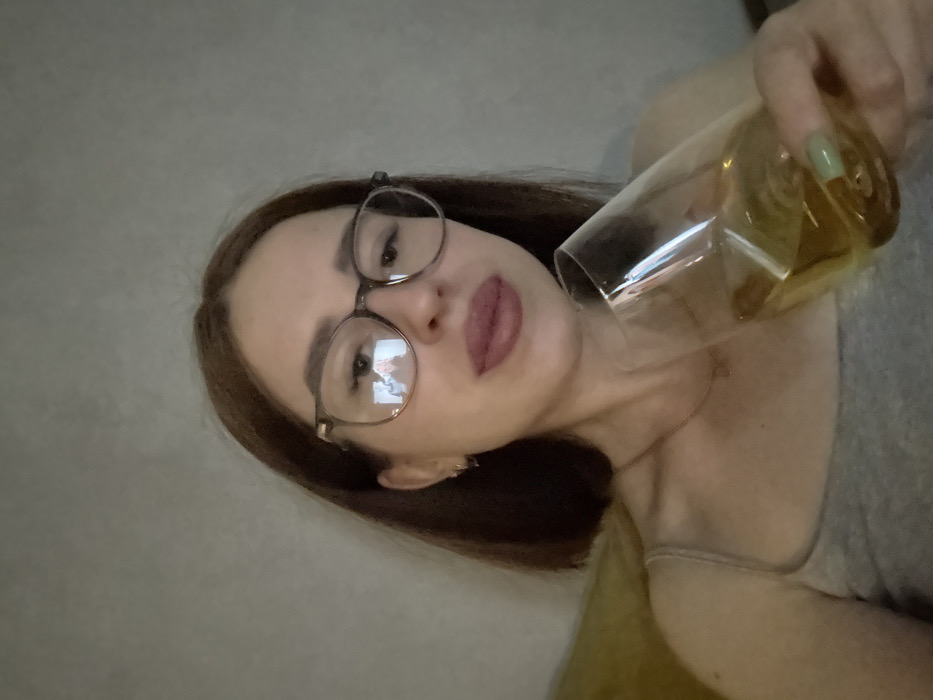 A female subject is depicted in a close-up, chest-up shot, presumably in Bol'shie Mkhi, Russia. She has shoulder-length brown hair and is wearing dark-framed glasses. Her lips are colored with light pink lipstick. She wears a light gray tank top, a delicate necklace with a small pendant, and small hoop earrings. Her right hand holds a clear, stemless wine glass containing a yellow-amber liquid. Her fingernails are painted with light green polish. A blurred reflection in her left spectacle lens shows what appears to be a person or an image of a person, possibly a male, with light-colored hair/beard and a light-colored garment. The background consists of a plain, light-colored, possibly textured wall, with a small portion of a yellowish surface visible behind her left shoulder.