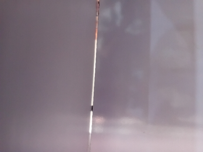 The image displays an interior scene characterized by a smooth, uniform, muted purple-grey surface. A horizontal, brilliant white light streak or slit bisects the image slightly above its vertical center. Within this illuminated slit, a small, dark, rectangular object is visible, positioned to the left of the image's horizontal midpoint, potentially a latch or hinge mechanism. The surface above and below the slit appears to be reflective, with subtle glare evident, particularly in the lower left quadrant. No individuals, overt actions, or interactions are depicted. The environment is indistinct and lacks identifiable features to determine a specific location within Lagos, Nigeria; it appears to be an enclosed, generic space.