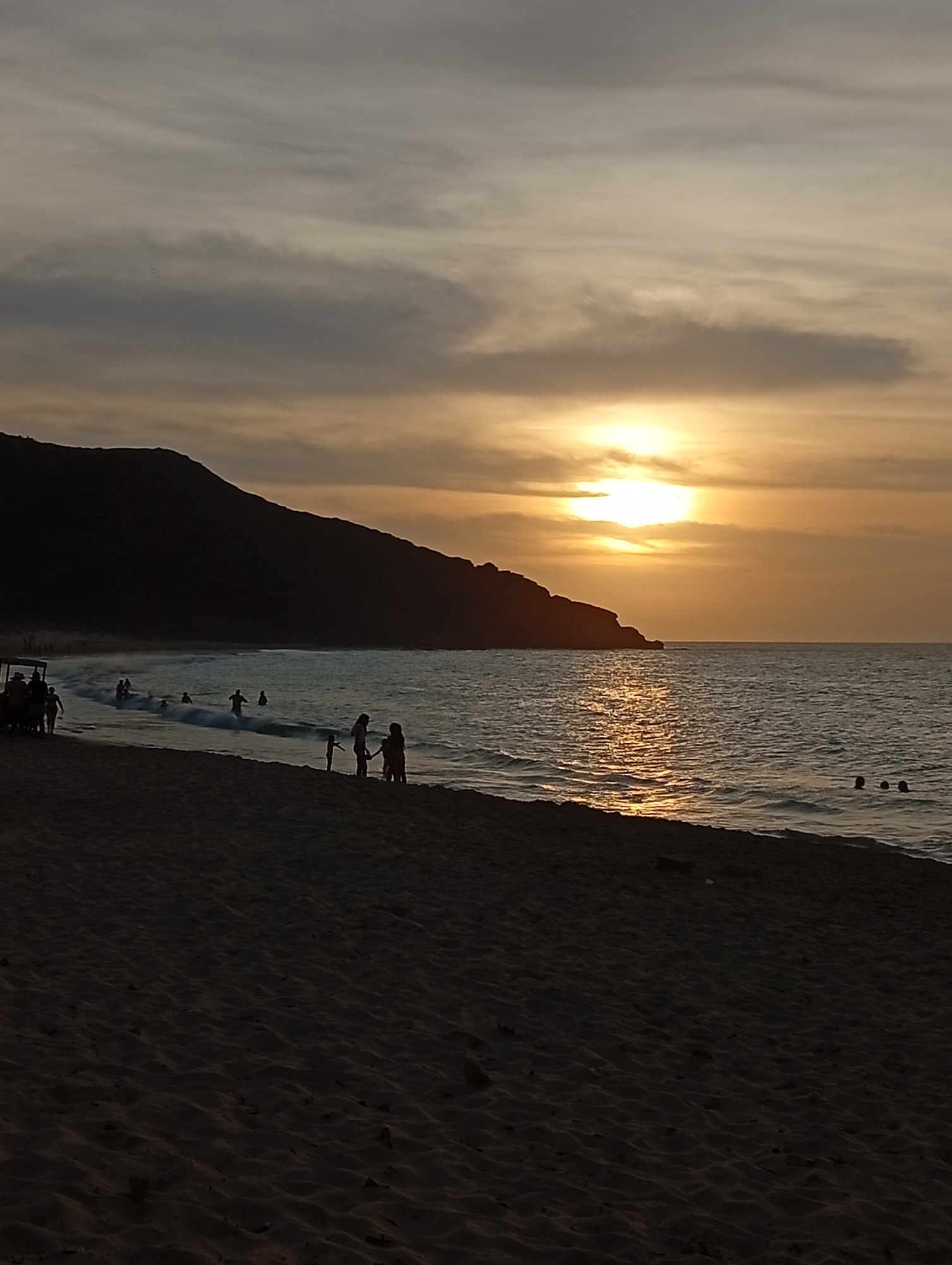 sunset scene at a beach. The sun is partially obscured by clouds, casting a golden light across the water. A large, dark hill or mountain is present in the background, extending into the ocean. Several people are visible on the beach and in the water, appearing as silhouettes against the bright light of the sunset. There is a dark sandy beach in the foreground. The scene is presumed to be near Altagracia, Venezuela.