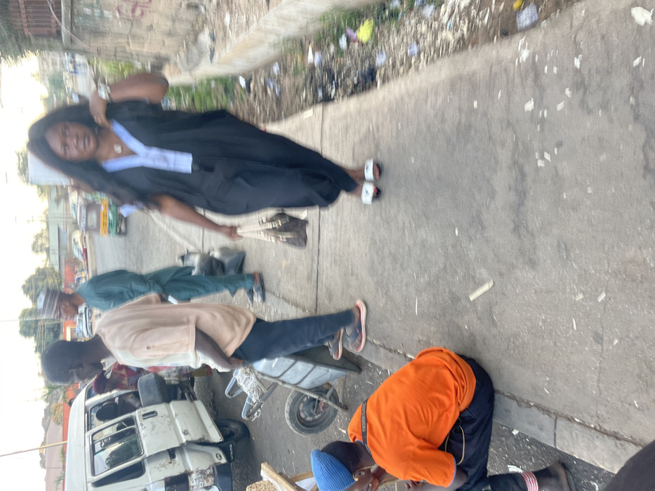 The image displays an active street scene in Jos, Nigeria. In the lower left foreground, an individual wearing an orange short-sleeved top, dark trousers, and a blue beanie is seated directly on the concrete pavement. To their right, a grey metal wheelbarrow with a single front wheel is positioned upright on the sidewalk. Standing near the wheelbarrow, a male figure is visible, dressed in a light beige short-sleeved top and dark trousers, with his hands positioned around his waist area, facing towards the left. Further back on the same pavement, a second male figure is standing, attired in a teal-colored traditional garment and a matching cap, facing towards the right. Dark-colored bags are placed on the ground near his feet. Moving towards the right side of the frame and in the mid-ground, a female figure with long, dark hair walks towards the viewer. She is wearing a loose-fitting black kaftan-style outfit with a light blue V-neck detail and white slide sandals. She carries a light brown handbag with a distinct pattern in her left hand, and her right hand is raised near her temple. On the far left, a white minivan, possibly a commercial passenger vehicle, is parked with its side door open, revealing several occupants partially visible inside. On the asphalt road in the background, a green and yellow auto-rickshaw (Keke Napep) is discernible, along with other vehicles and distant structures under daylight conditions. The concrete pavement and the adjacent gutter on the right are littered with various pieces of refuse and debris. A rough concrete wall with some indistinct graffiti runs along the right edge of the frame, bordering the gutter.