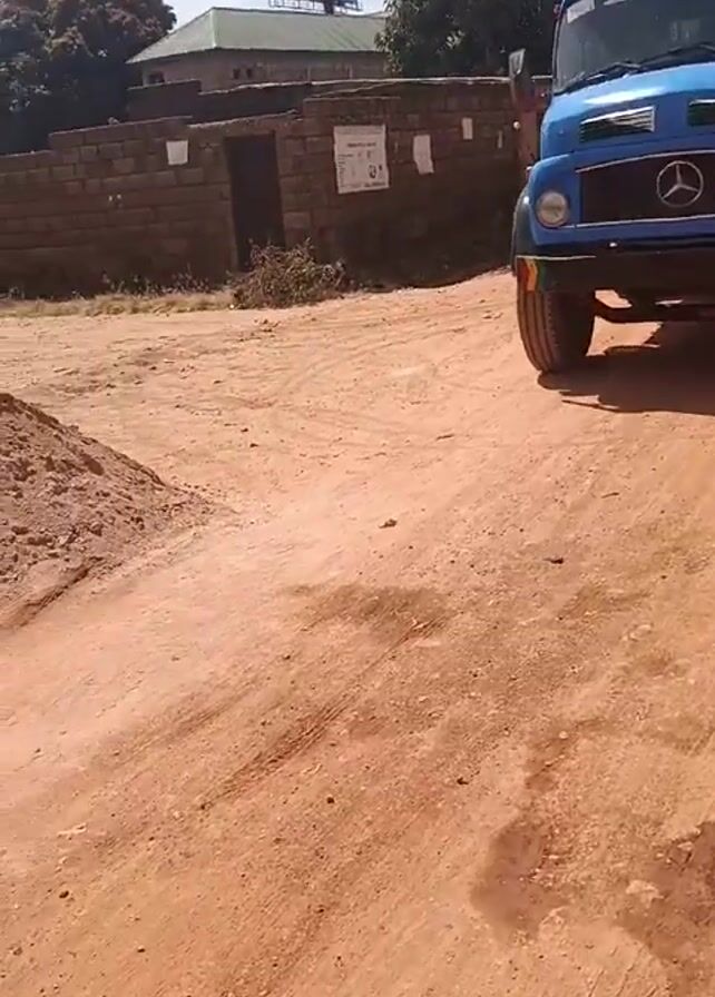 The video depicts a blue Mercedes-Benz truck parked on a dirt road. The road is uneven and marked with tire tracks. There are piles of dirt nearby, and a brick wall lines one side of the road. In the background, trees and buildings are visible. At one point, a person is seen standing near the truck, but they are not actively interacting with it. The sky is light blue with scattered clouds.