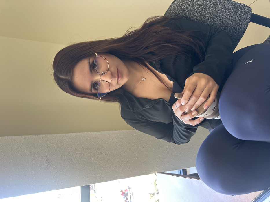 A young adult female is depicted seated indoors in Fraccionamiento Los Heroes Queretaro, Mexico. She is positioned slightly angled towards the viewer, looking directly into the camera. She possesses long, dark brown hair with a central parting and wears gold-rimmed cat-eye glasses. Her attire consists of a dark blue or black athletic-style jacket, partially unzipped over a dark blue undershirt, and dark blue leggings with a white logo on the left thigh. A silver-colored necklace with a small pendant is visible around her neck, and she has two rings on her left hand's ring finger. Both hands are clasped around a light brown and white patterned insulated drink container, held in front of her. She occupies a dark grey textured fabric chair, partially visible on the right. To her left, a large window reveals a brightly lit outdoor environment with blurred background elements. The interior walls are a light beige color, with faint, textured markings on the wall next to the window, including what appears to be "baby" and heart shapes.
