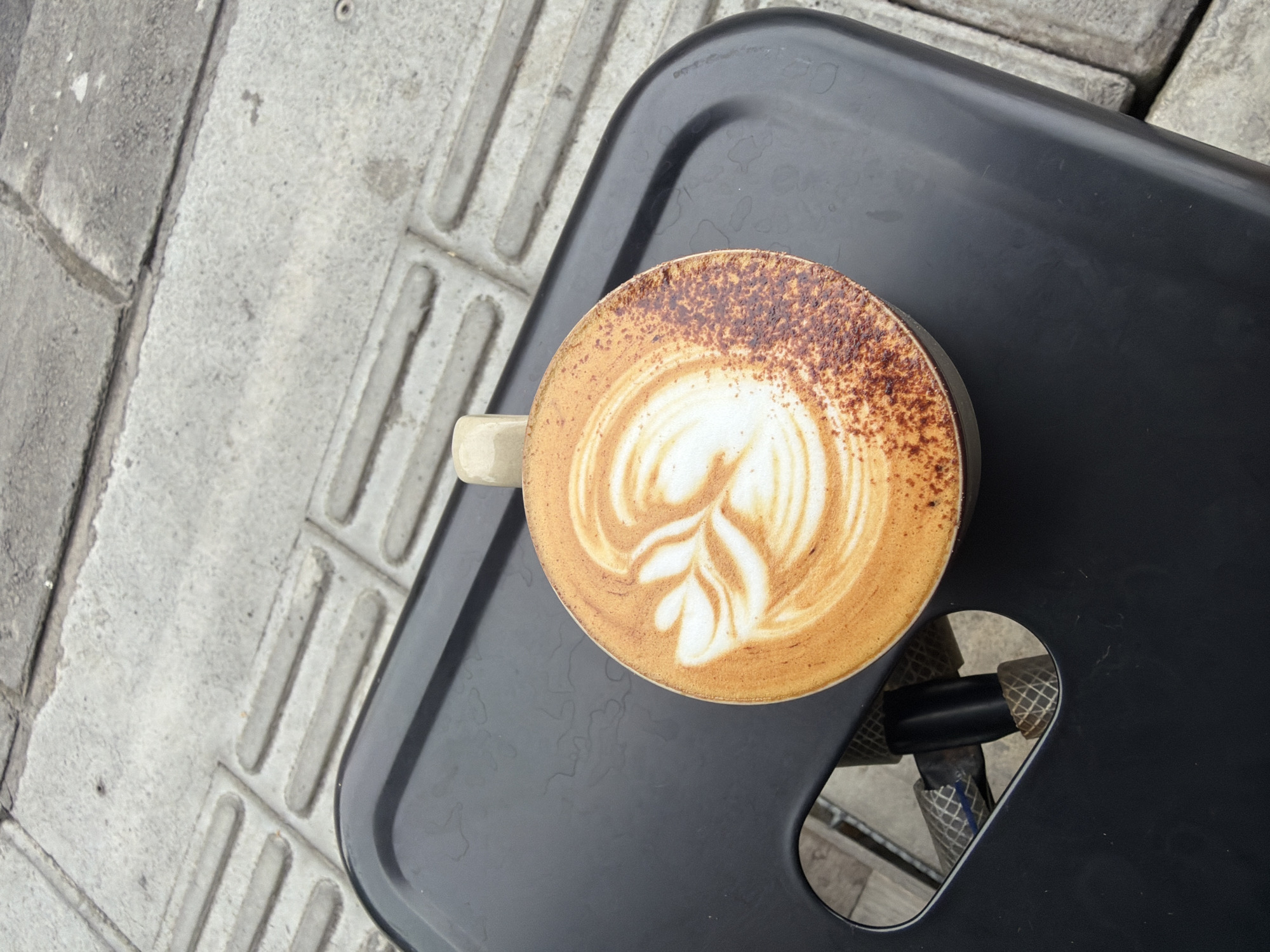 A beige ceramic mug containing a latte with white foam art, depicting a rosetta leaf design and sprinkled cocoa powder on the right, rests on a dark grey, possibly plastic, tray or table surface. The tray exhibits faint liquid stains and features a rounded corner on the right, along with an irregular cut-out on the lower left revealing a segment of a black metal structural component, potentially a chair or table leg. The background consists of light grey concrete pavement sections, some with embedded parallel tactile strips for pedestrian guidance, indicating an outdoor urban setting in the city of Unknown, Indonesia.