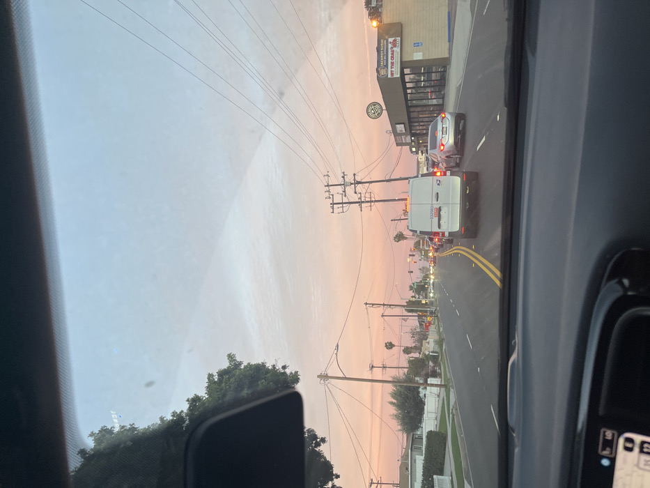 A view from inside a car shows a street scene at dusk. A white van and a silver sedan are in front, with a building partially visible on the right. Utility poles and lines stretch across the sky, which is tinted with pink and orange hues. The road has double yellow lines. The car's dashboard and windshield are in the foreground, partially obscuring the view.