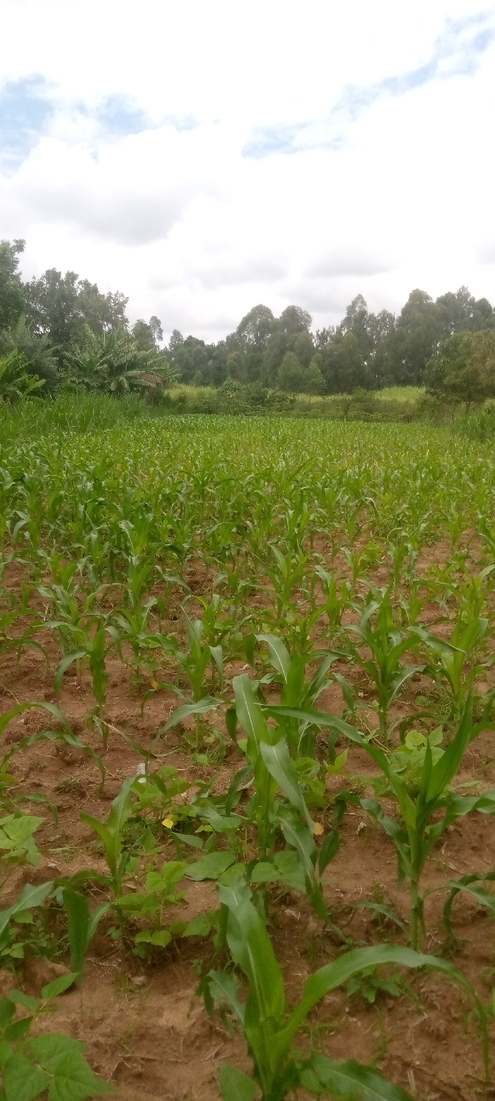 field of young corn plants growing in rows. The plants are green and healthy, and the soil is brown and dry. There are some weeds growing among the corn plants. There are trees in the background, and a blue sky with clouds can be seen in the upper part of the image. The location of the field is on the outskirts of Burundu, Kenya (latitude: 0.459, longitude: 34.776).