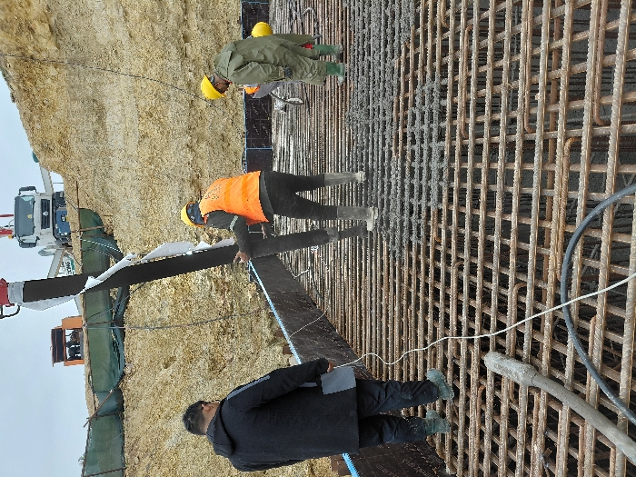 The image depicts an active construction site in Sidi Moussa Ben Ali, Morocco, under an overcast sky. The foreground and mid-ground show a horizontal slab under construction, featuring an extensive grid of steel reinforcement bars (rebar) partially covered with fresh, wet concrete. Four individuals are present. In the center-midground, a worker wearing an orange safety vest, yellow hard hat, and grey rubber boots is actively guiding a large black concrete pump hose, from which wet concrete is being discharged onto the rebar grid. To his right, another worker, dressed in an olive-green jumpsuit, yellow hard hat, and green rubber boots, operates a grey concrete vibrator tool, consolidating the freshly poured concrete. A fourth person, partially visible to the right, also wears an olive-green outfit and likely a hard hat. In the foreground-left, a man in a black jacket, black pants, and green rubber boots stands observing the operation, holding a grey rectangular device, possibly a tablet or clipboard, connected to a white cable extending to the ground. On the rebar grid in the foreground, a grey concrete vibrator is visible, along with a black hose and a white cable. Dark formwork panels line the edges of the slab. The background features a large, excavated dirt and rock embankment. On top of this embankment, a white concrete mixer truck with an extended boom and another piece of yellow construction equipment are visible. Green protective netting or tarps are draped along sections of the embankment slope.