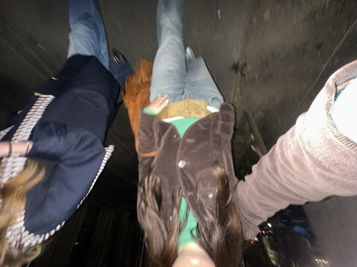 A low-light, motion-blurred image captures two individuals walking at night on a paved urban surface in Antwerp, Belgium. The primary subject, seen from the upper torso down on the left, wears a brown corduroy jacket over a light green top, light blue jeans, and a tan belt bag. A brown fringed shoulder bag hangs from their right side. Long dark hair is visible. An arm, likely holding the camera, extends into the foreground. To the right, a second individual is partially visible, wearing a dark blue overcoat, light blue jeans, and a light-colored scarf with dark stripes draped over the shoulders. This individual also has long, lighter brown hair and a metallic bracelet on the left wrist. Both subjects appear to be moving forward. The environment consists of a dark, possibly asphalt or concrete, ground and an indistinct, dimly lit urban background with faint light sources visible in the distance.