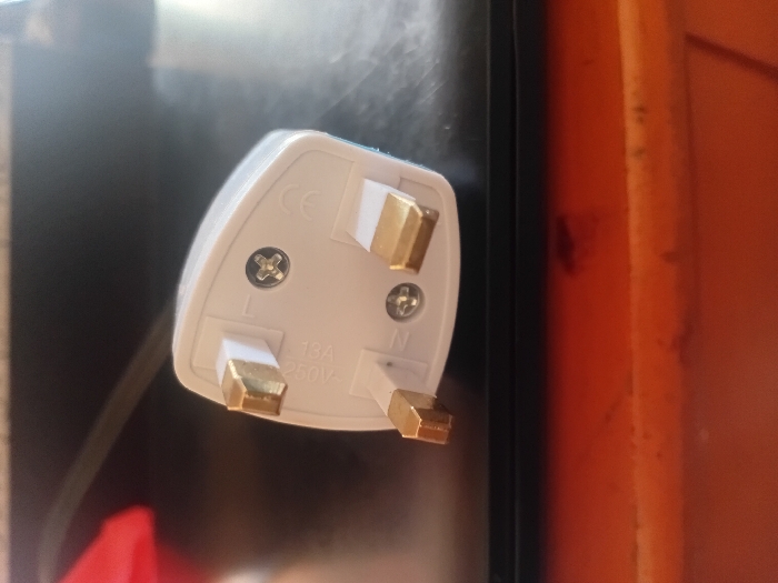 - "The scene depicts a white, three-pin electrical plug resting on a dark, reflective surface, which is situated above an orange-brown surface" by FM-jVvf02, licensed under CC BY 4.0