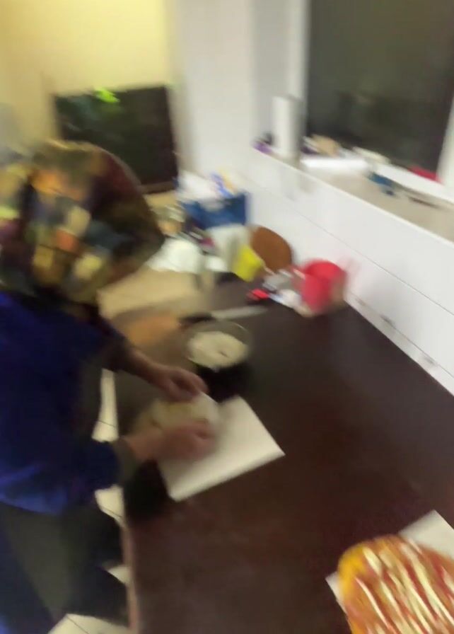 pizza being prepared on a dark brown table in a kitchen or food preparation area. The pizza is on a piece of paper and has toppings with ketchup and mayonnaise drizzled on top. A person in a blue apron and a colorful patterned shirt is preparing dough on a piece of paper next to the pizza. The camera then pans to show a larger room with white tiled walls, a large oven, multiple tables, and shelves. There are loaves of bread on one of the tables. The lighting is bright and clinical.