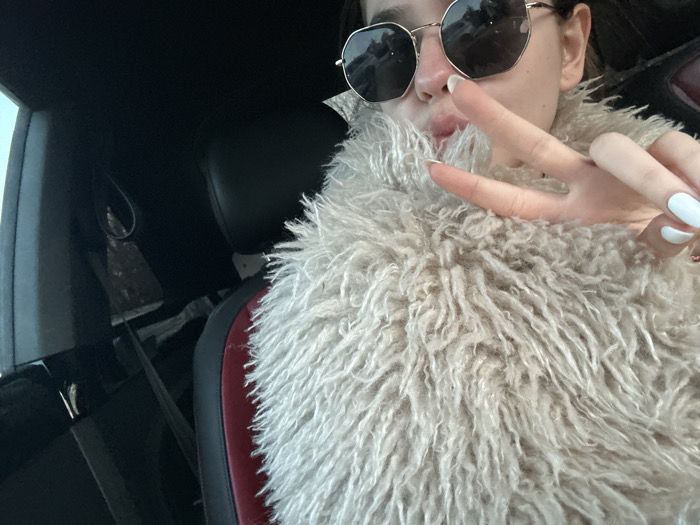 The image displays a partial, close-up view of an individual, presumed female, situated within the interior of a vehicle. The subject's upper face is obscured by large, hexagonal-framed sunglasses featuring reflective dark lenses. The visible lower face shows slightly pursed lips. The individual is dressed in a voluminous, light-colored, shaggy or curly faux fur garment that covers the chest and neck area. The left hand is raised in front of the fur, forming a "peace" sign (V-sign) with the index and middle fingers extended. The fingernails are painted a light blue or white. The background reveals components of a vehicle interior, including a dark headrest, a car seat with red side bolsters, and a visible seatbelt. No external features or landmarks are present in the image to verify the specific location in Oreshak, Bulgaria; the scene is confined to the vehicle's interior.