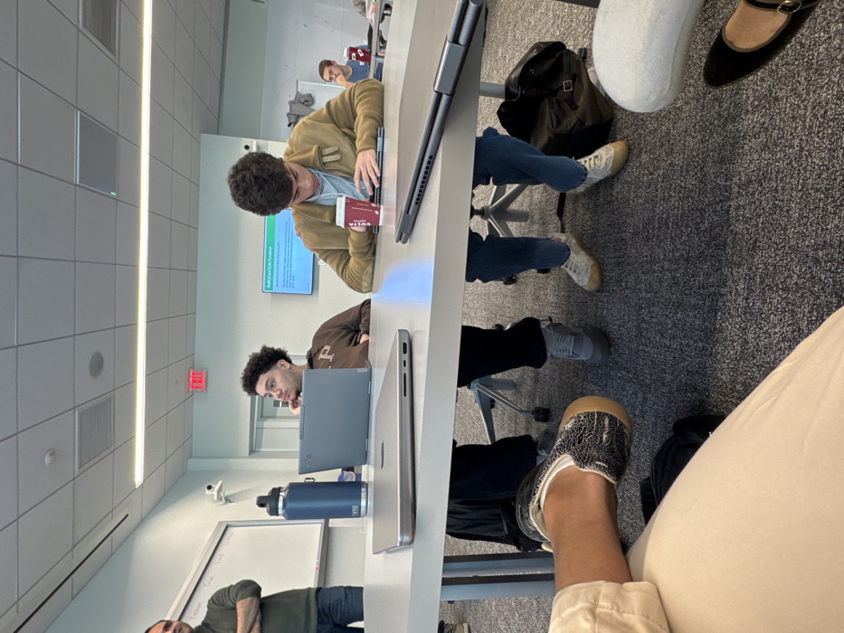 This image depicts an indoor scene within a classroom or meeting room located in Wellesley, United States. The environment features light-colored walls, a grey carpeted floor, and a suspended ceiling with square acoustic panels and fluorescent strip lighting. A prominent red "EXIT" sign is visible above a doorway on the back wall. In the foreground, a light-grey rectangular table spans the width of the frame. On the left side of the table, a silver closed laptop (likely a MacBook) rests. Partially visible legs and feet belonging to an unseen person or the photographer are in the immediate foreground, showing light-colored pants and black-and-white patterned sneakers with tan soles. To the immediate right, another foot wearing a black shoe with a tan strap is visible. Five individuals are visible. On the far left, a male with dark hair and a beard, wearing a dark green long-sleeved shirt and blue jeans, stands with his arms crossed, facing towards the right side of the frame, near a whiteboard with some writing. Seated at the table to his right is a male with dark curly hair, wearing a brown hooded sweatshirt with "GAP" visible on the chest and dark pants. He sits in an office chair, with a grey laptop (likely a Lenovo) open in front of him, and his left hand resting on his chin. A dark blue Yeti water bottle stands on the table to his left. Further to the right, another male with dark wavy hair, wearing a light brown jacket over a light blue shirt and blue jeans, is seated. He holds a red and white "Costa Coffee" cup in his left hand while looking down at a dark tablet or laptop with a stylus/pen on the table in front of him. A dark backpack rests on the floor beneath his seat. Behind him, on the far right, a male with short dark hair, wearing a blue shirt, is partially visible, looking towards the front of the room. A large wall-mounted display screen on the back wall shows text including "Political and Socio-Economic." A white dome-shaped security camera is mounted on the wall above the whiteboard on the left.