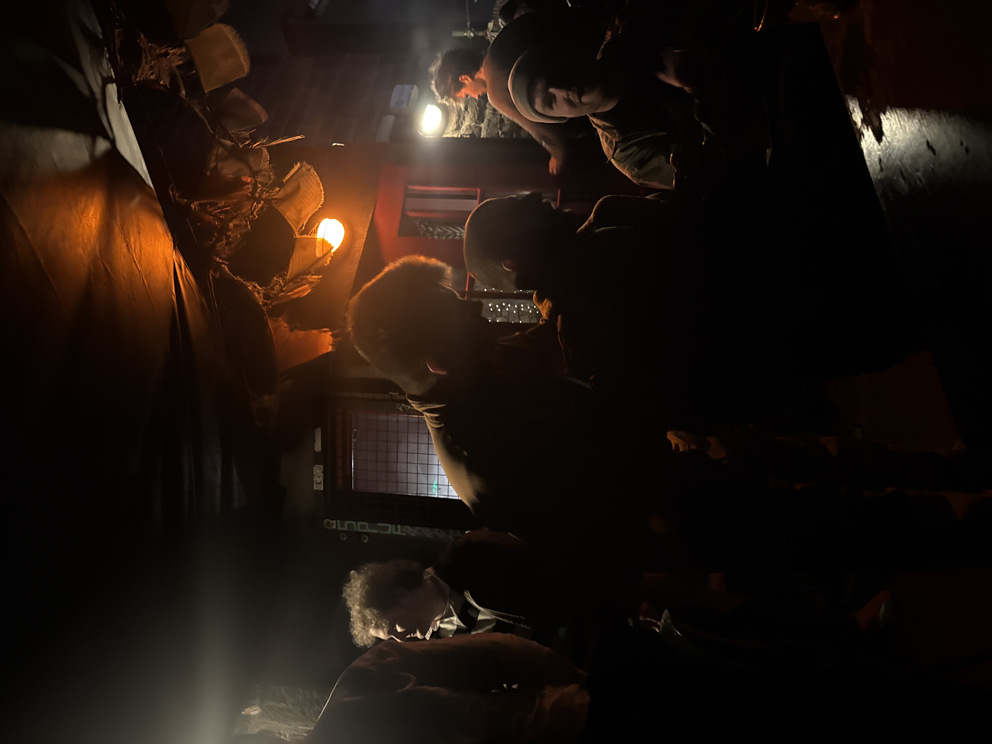 A nighttime interior scene features a dimly lit space. Several individuals are present, with details of their appearance partially obscured by the darkness. A light fixture emits an orange glow on the left, illuminating nearby objects that appear to be wrapped or covered. A barred window is visible in the middle ground. The specific location within the city of Unknown, Unknown is not discernible from the image.