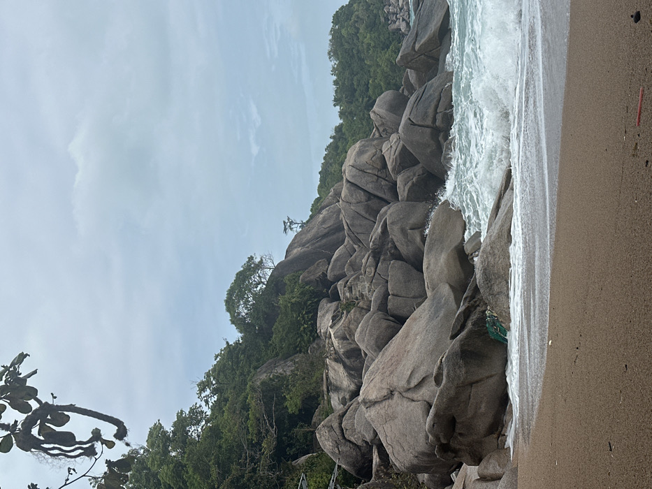 Rocky coastline with a beach. Large grey boulders cascade down to meet the sand and water. Waves crash against the rocks and shoreline. Green foliage and trees grow on and around the rocks. The sky is overcast and pale grey. A branch from a tree extends into the frame from the lower left. A red plastic straw is visible on the beach.