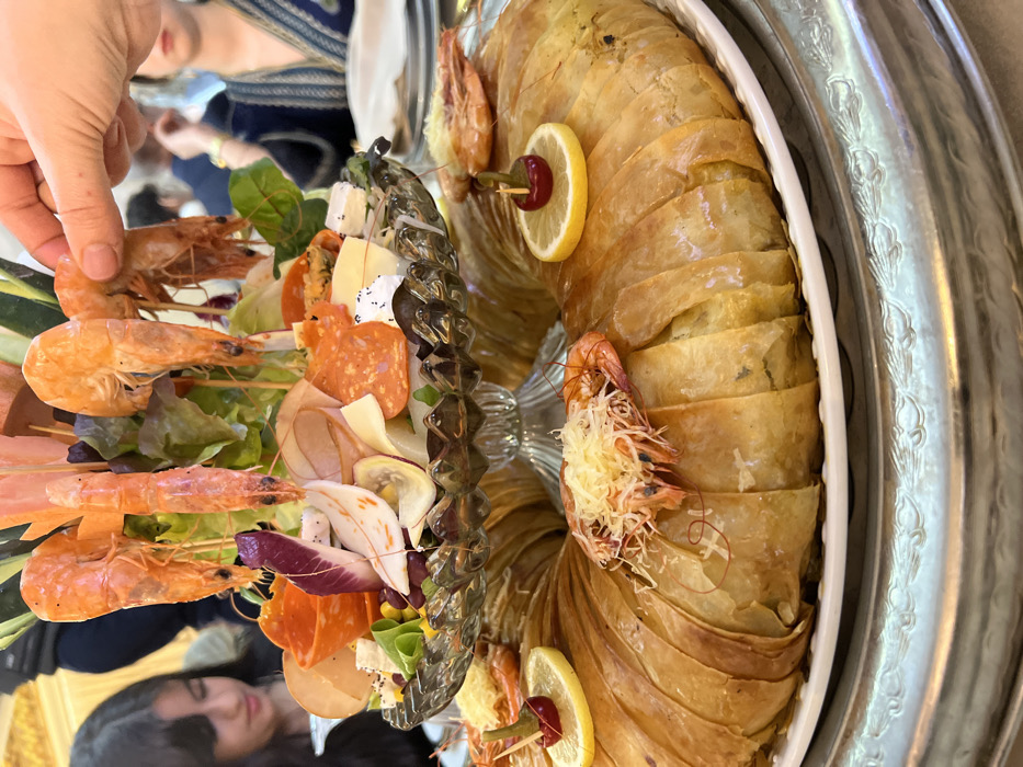 A silver serving platter presents a Moroccan bastilla encircling a central arrangement of shrimp skewers, assorted cheeses, salami slices, onions, and lettuce