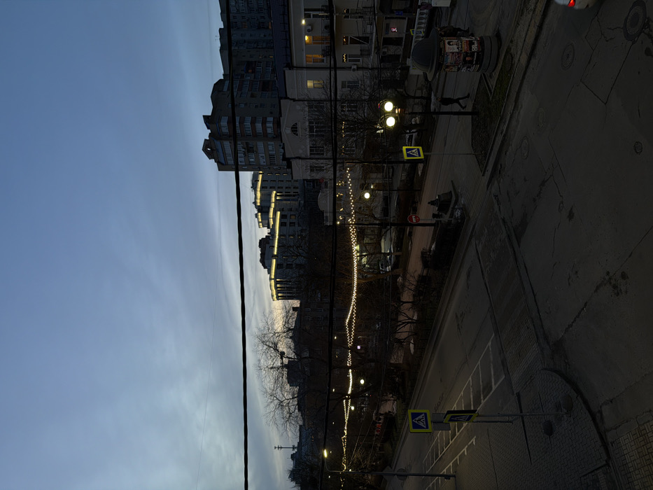 A cityscape view features tall buildings against a dusk sky. Streetlights illuminate the street-level scene. Decorative lights hang amidst bare trees. A pedestrian crossing sign is visible near the sidewalk. A utility pole runs vertically through the composition. The image is rotated ninety degrees clockwise.