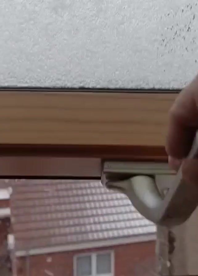 window being opened to reveal a snowy scene outside. Initially, the window is opaque with snow. The window's latch is turned, and the window swings open, showing rooftops covered in snow, a yard, and a street. It is snowing. The window is then closed again.